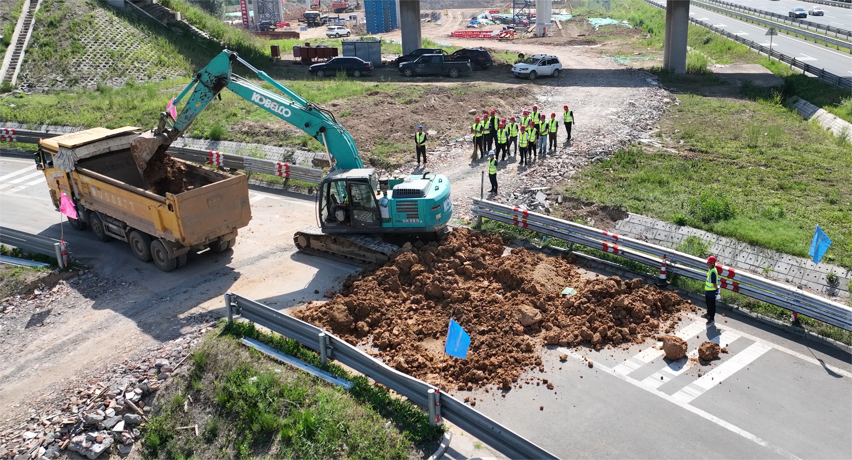 本次演練模擬的是某處道路發(fā)生山體滑坡引發(fā)大量的土方在路面堆積造成交通阻斷。